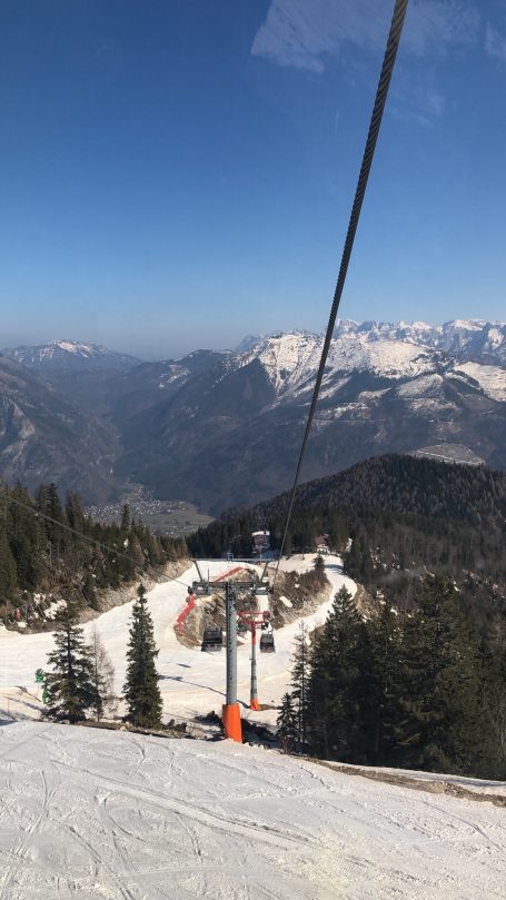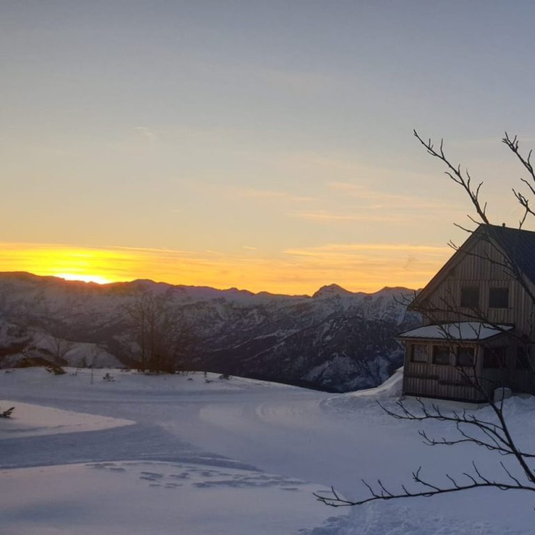 Abendlicher Blick aus unserer Steinkogelhütte auf das verschneite Bergpanorama des Salzkammerguts